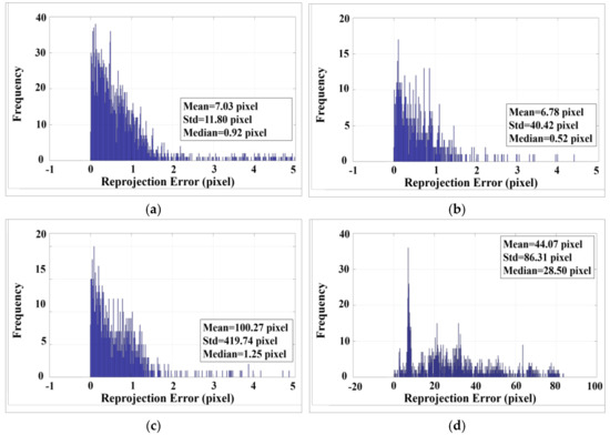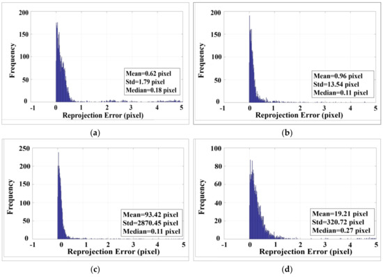 Histogram of the reprojection errors for the second image pair. (a) The proposed method; (b) SIFT; (c) SURF; and (d) ORB.