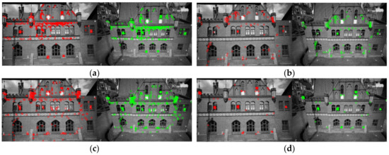 The effect of the distribution of matches on the sparse point cloud generation is evident from Figure 13 and Figure 15. In Figure 13b,c, very few points are in the background, and most of the points are concentrated on the front building façade. Hence, it is evident that triangulation would lead to a two-dimensional (2D) surface in Figure 13b,c, which is opposite to the case in Figure 13a, in which points are distributed over different scene structures.