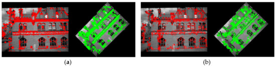Feature matching is the basis of many applications in remote sensing, photogrammetry, computer vision, and several other fields. Examples of feature matching applications include, but not limited to, photo-mosaicking, three-dimensional (3D) reconstruction, visual odometry, and object tracking. Due to its importance, feature matching has been the topic of many publications for several years, starting with Moravec’s corner detector [1]. The conventional methodology of feature matching algorithms comprises three main steps: detection, descriptors assignment, and preliminary feature matching. The preliminary feature matching procedure is based on a comparison of the distance—Euclidean for instance—between descriptors. Preliminary matching is typically followed by an outlier removal algorithm such as Random Sample Consensus (RANSAC) [2] and Maximum Likelihood Estimation Sample Consensus (MSAC) [3]. The RANSAC technique is based on the successive attempts at fitting a model to a subset of preliminary matched features. Then, the model is gradually enhanced by adding more corresponding feature points.