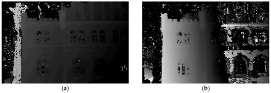 Figure 20 highlights the impact of matching methods on the disparity map. Figure 20a,b are the results of dense matching using the fourth image pair after the images are rectified based on the proposed matching method and on SURF, respectively. The disparity map in both cases is computed using the Semi-Global Matching [38]. It is evident that in both images, there exist errors due to illumination difference. Nevertheless, the disparity map in Figure 20a is far better than the one in Figure 20b. The rectification in Figure 20b is affected by more feature points being located on the building façade, which in turn results in an inaccurate fundamental matrix and flawed rectification. As a result, only part of the building seems to be correctly matched, and the rest of the image is noisy.