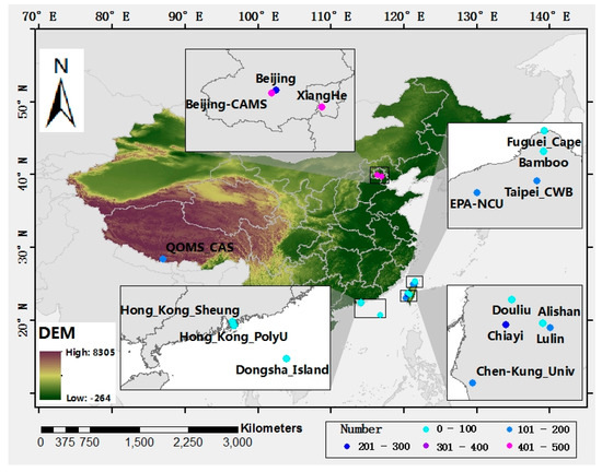 The distribution of AErosol RObotic NETwork (AERONET) stations in China and the number of valid days for the 16 AERONET stations (Table 3) from 7 July 2015 to 1 October 2017. The number of valid days is labeled in different colors. DEM is defined as the Digital Elevation Model.