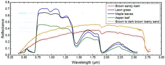 Curve of the spectrum for five kinds of typical features from our 30 selected of features: Brown sandy loam (red line); Lawn grass (blue line); Maple leaves (black line); Aspen leaf (olive line); and, Brown to dark brown loamy sand (orange line).