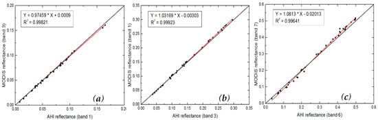 Linear fitting of reflectance in the (a) blue band; (b) red band; and, (c) near-infrared band of AHI and MODIS.