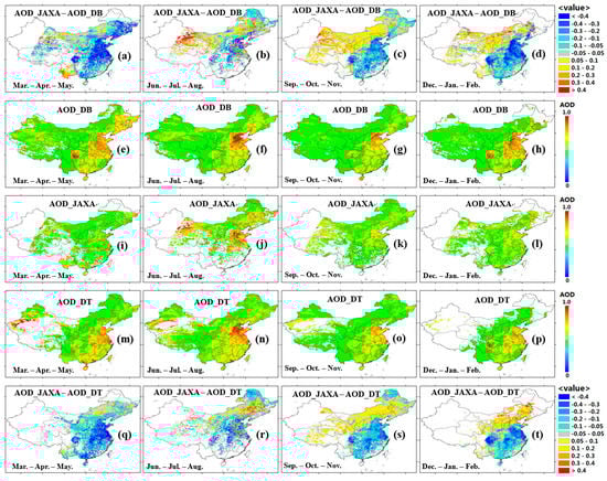 Each column represents a season: from left to right are spring (March, April, and May), summer (June, July, and August), autumn (September, October, and November) and winter (December, January, and February). From top to bottom are the difference between aerosol optical depth (AOD)_NEW and AOD_DB (a–d); the mean value of AOD_DB (e–h); the mean value of AOD_NEW (i–l); the mean value of AOD_DT (m–p); and the difference between AOD_NEW and AOD_DT (q–t). All of the results use full quality data from July 2016 to June 2017.