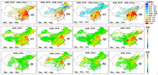 Each column represents a season, and each row represents (from top to bottom) the following: the difference between AOD_NEW and AOD_JAXA (a–d); the mean value of AOD_NEW (e–h); and the mean value of AOD_JAXA (i–l). All of the results use full quality data from July 2016 to June 2017.