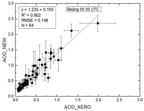 In this paper, we select one AERONET site, Beijing at 05:30 (UTC) from July 2016 to June 2017, to calculate the standard deviation of AOD_AERO and AOD_AHI. The correlation between AOD_AERO and AOD_NEW has a relatively high R2 in Figure 9. The data is dense at low values and it become sparser at a higher optical thickness. As the value becomes larger, the standard deviation becomes larger. In terms of satellite data, this may be due to regional differences.
