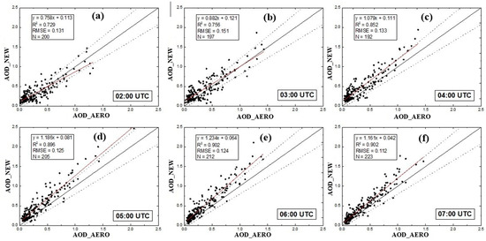 Scatterplots of the AOD_NEW and AOD_AERO from 2:00 to 7:00 (UTC) (a–f).