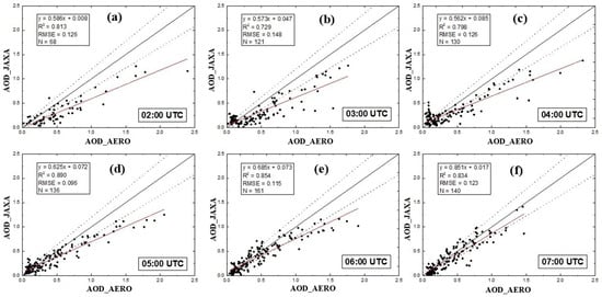 Scatterplots of the AOD_JAXA and AOD_AERO from 2:00 to 7:00 (UTC) (a–f).