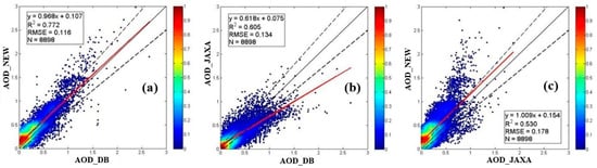 Density scatterplots of (a) AOD_DB versus AOD_NEW; (b) AOD_DB versus AOD_JAXA; and, (c) AOD_JAXA versus AOD_NEW.