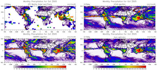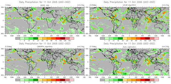 Daily comparisons (Figure 3) also show that the Auto-Estimator gives similar rainfall fields to those of other more complex algorithms in terms of detail and structure. Validation against the land-only, gauge-based Global Precipitation Climatology Project (GPCP) [45,46] (Figure 2 and Figure 3, upper-left panel) also suggest that the Auto-Estimator is well-suited for use as a surrogate of a realistic global precipitation field.
