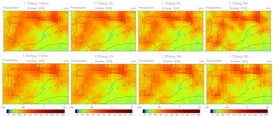 An example of monthly-aggregated precipitation simulations at several spatial resolution and time sampling for the October 2005 case study. The 0.05°/15-min estimate is the reference ‘truth’.