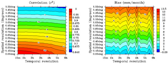 Figure 5 explores all the combination between the estimates in terms of correlation, RMSE, bias and entropy. The correlation plot shows the importance of the spatial sampling to maintain the GMS performances. The correlation degrades faster in the spatial resolution direction, going below 0.90 r2 at half a degree (for a 15-min temporal sampling), which is a working polar MW spatial resolution. In contrast, a revisiting period of 3 h decreased the correlation to 0.87 r2. In environmental applications where precipitation estimates are integrated into models, multiplicative errors would noticeably worsen the final output in the latest case. In term of correlation, worsening the temporal resolution does not affect that much the estimates: Correlation isolines appear almost parallel to the x-axis.