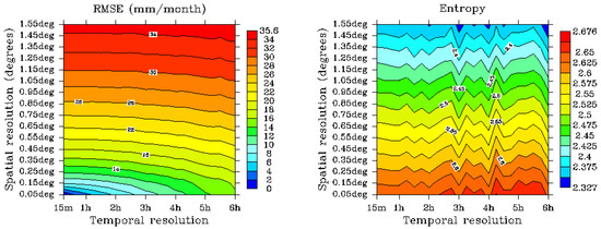 Perhaps more importantly for environmental applications, the entropy plot depicts the expected loose in informational content. The Boltzmann-Gibbs-Shannon entropy is a good estimate of how peaked the histogram of the precipitation estimates is [47]. Flat histograms correspond with a maximum entropy state, giving us little information on the structure of the precipitation, whereas a peaked histogram indicates null uncertainty (zero entropy) on that variable. Therefore, increased entropy would mean a smoother distribution, and less entropy that the reference state would indicate a change to a peaked histogram. Here, Figure 5 shows that temporal resolution is less important for conserving the informational content. Thus, a 0.05°/6 h estimate conserves most of the entropy of the original estimate. If the estimates are to be used to characterize the statistical properties of the precipitation over a region, isentropes mark how to preserve the informational content of the estimates when both spatial and temporal resolution are changed.