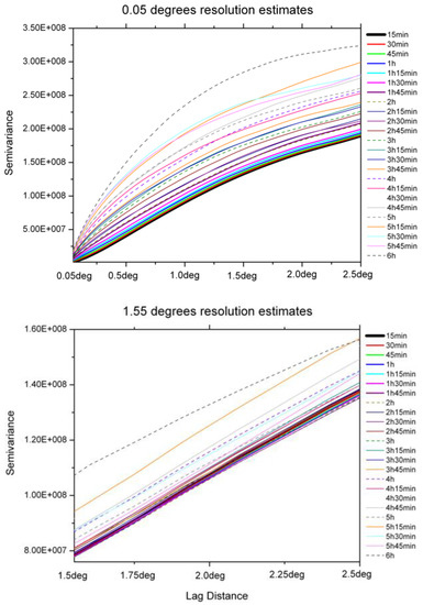 To better appreciate the variation in the spatial structure of the precipitation, it is necessary to use a spatial statistic measure such as the variogram. Figure 6 depicts the variograms for the 0.05° and 1.55° spatial resolution. This measurement provides complementary information on the statistical properties of the precipitation, showing the extent at which temporal sampling increases the variance of the field, as some short-living events are missed by the sensor. In both panels, temporal resolution decreases, as does the semivariance.