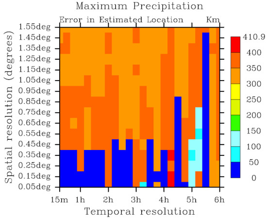 Errors in the estimated location of the maximum precipitation at the spatial and temporal resolutions explored in the paper.