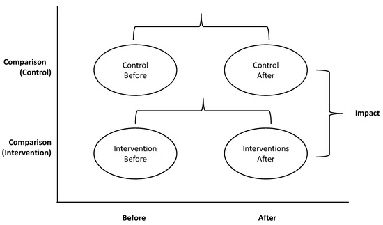 A common method for evaluating the impact of environmental and ecological interventions is the BACI (Before-After, Control-Impact) method [10]. Figure 1 provides a schematic overview of the BACI framework. For the intervention area, the before and after variables of interest are measured. These are compared with the before and after measures of the same variables at a control site. The differences between the intervention and control sites determine the impact generated by the interventions [11,12]. Other studies have used BACI to study Marine protected areas [13], integrated marsh management [14] and ecosystem recovery [15].