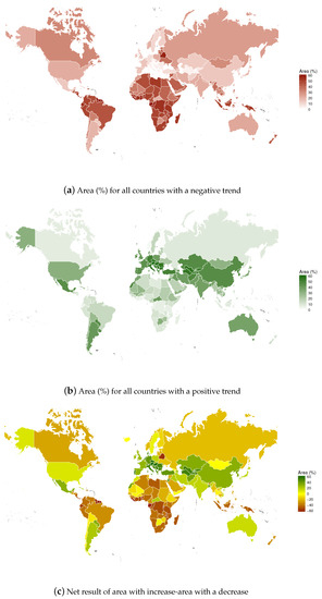 Vegetation growth is a highly dynamic process in space and time. to estimate the net changes resulting in either growth or decline of each country, we used results of Figure 3a,b. The final result was obtained by calculating the difference between vegetation growth (positive trend) and vegetation decline (negative trend) over any given area. Negative numbers indicate a net negative trend whereas positive numbers indicates net greening. These results are shown in Figure 3c. It can be seen that tropical and sub-tropical regions show mostly negative trends. Also, most countries in Africa show negative numbers. Countries in Europe, Central and East Asia mostly have positive trends, which indicates an overall greening of their local environment. Whereas we have a baseline (before) and study period (after) defined no impact and control were defined.
