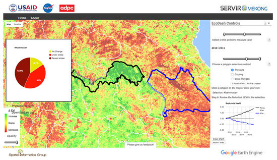 The results in the previous figures are based on administrative country boundaries for the sake of simplicity. However, with the sort of geospatial technology we have used for this study, one can also draw or select custom geographies to investigate trends in cumulative EVI in relation to other geographies. As noted previously, the ultimate goal of this study was to create a user-friendly interface that would enable policy-makers, land use managers and other non-technical practitioners to use advanced monitoring and imaging techniques. Therefore, we developed an Ecological Monitoring Dashboard (global EcoDash; http://globalecodash.sig-gis.com/; the link and github repository are in Supplementary Materials), built on the Google App Engine framework, that communicates with Google Earth Engine. Figure 4 shows the user interface of the EcoDash tool. Users can here define the baseline and analysis time periods, as well as define the geographies they wish to compare or investigate. Users then receive output that includes time series graphs and statistics on the change in bio-physical health for user-defined regions.