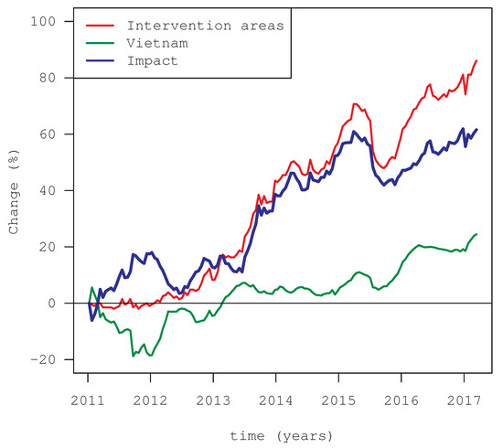 Figure 6 shows the cumulative EVI anomaly for the period 2011–2017 using the previous period as baseline. The green line shows the net change for the whole country (control-after) and the red line for the intervention area (impact -after). The blue line shows the difference between the control and impact topographies/areas. A rapid improvement in vegetation growth can be seen at the onset of the project in the impact areas, whereas negative vegetation growth was found for the control sites. Figure 6 clearly shows that the impact area under the VFD program experienced increased vegetation growth over the course of the project, as compared to the rest of the provinces in Vietnam, which were under similar environmental conditions such as soil and climate. As of March 2017, 86% of the net area in the intervention zones show increased vegetation cover while the overall increase in vegetation for the rest of Vietnam was only 24%. The 2015 drought event can also be seen in Figure 6.