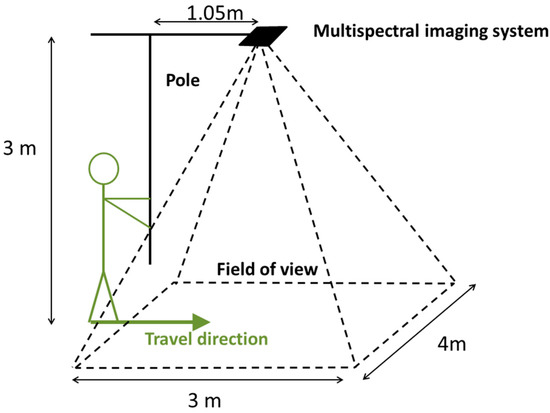 Multispectral images were acquired with a camera mounted on a pole at 3 m above ground. The acquisition system was developed by AIRINOV (Figure 1). It was composed of different sensors including a light sensor and a multispectral imaging system (multiSPEC 4C, AIRINOV, Paris, France). These acquisitions were performed to provide data at a spatial resolution of 6 mm/pixel.