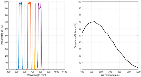 Transmittance of the filters (a) and sensitivity curve of the sensors (b) from multiSPEC 4C producer datasheet.