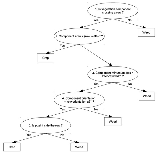 Decision tree applied on each connected component to discriminate crop from weeds using detected rows and shape analysis.