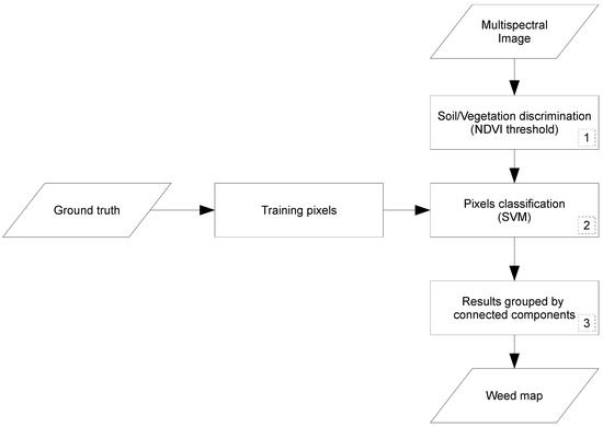 The first step is the same as the second step described for the spatial method: discrimination between soil and vegetation based on NDVI value. The second step classifies each pixel using SVM classification method, this supervised method is initialized with the training dataset (pixels manually selected for each image). The pixel-centered classification from the previous step produces isolated pixels of one class in another class. To overcome this issue, these results are grouped with a connected-component approach in the third step. Equation (2) explains this process: when the connected component is identified as k class (where k is crop or weed). The resulting weed map is made of each connected component labeled as weed in the previous step.
