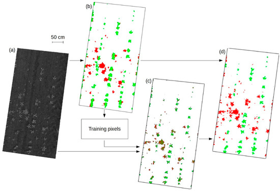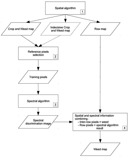 The spatial and spectral methods described in previous sections have specific limits: the first is not able to detect weed inside crop rows and the second requires manual supervision. A combination of these methods could overcome these limits and improve weed detection. This approach is based on two main assumptions: (1) Row is mostly crops and inter-row is mostly weeds and (2) The classification results obtained from the spatial method are accurate enough to be used as a training dataset. The procedure is described in Figure 7.