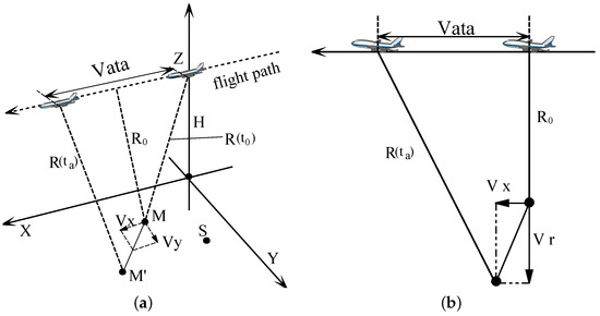 The geometry model of a single-channel strip-map mode SAR system is shown in Figure 1a. A spatial Cartesian coordinate system is used to depict the geometry, whereas S represents a stationary target and M denotes a moving target with cross-track velocity and along-track velocity . The SAR sensor flights at the height of H, is the forward velocity of the platform while is the flight time of the platform, also known as slow time. and denote the nearest and the instantaneous slant ranges of the target, respectively. Similarly, X represents the nearest ground range of the target. The instantaneous coordinates of the platform and the moving target can be defined as and .