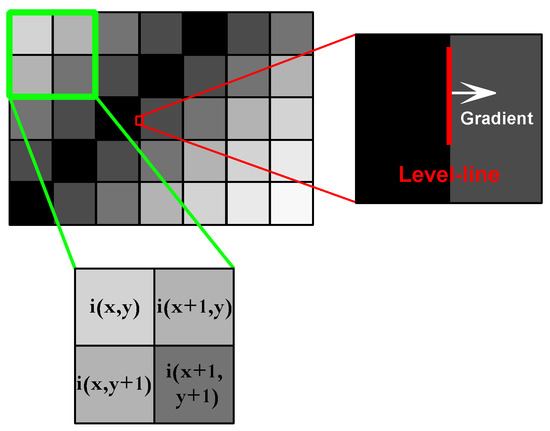 For the edge of the line in the image, the gradient magnitude is larger than that of the adjacent pixels and the gradient direction becomes uniform. The extended direction of the edge is perpendicular to the gradient direction. By rotating the original level line angle 90 degrees counterclockwise, here the level-line angle can be computed as