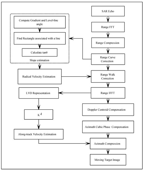To tackle these issues in the aforementioned methods, in this paper, a novel imaging algorithm based on the Slope Detection strategy combined with LVD (SDLVD) is proposed to obtain a high quality SAR image and precise motion parameters. In order to facilitate the analysis and conclusion, a general SAR geometry was adopted here. Then, based on the principle of gradient and level-line angle [47], an efficient and accurate slope estimation method is applied into estimating the target trajectory slope and correcting the range walk migration. Next, due to the advantageous performance in representing multiple moving targets in a Doppler Centroid Frequency and Chirp Rate (CFCR) domain, LVD is used to obtain the Doppler modulate rate of the moving target [10,46,48,49,50,51], meanwhile, the along-track velocity can also be calculated. After the azimuth compression, the final image of moving target can be well focused. In the end, simulation results are exhibited for the certification of the proposed algorithm.