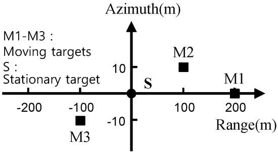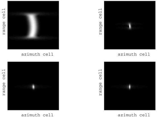 In the aforementioned analysis, the RCM of the moving target must be compensated to obtain a focused SAR image. After the range compression, due to the range curve migration, the straight line trajectory of the moving target becomes deformed. This kind of distortion can lead to a large estimation error in the detection of the slope of the trajectory, therefore, the range curve migration must be corrected ahead of the detection of the slope. Nevertheless, is an unknown parameter in the seventh exponential term in Equation (6). Since the fact that the along-track velocity of moving target is much smaller than the velocity of platform, it is available for the approximation to ignore the effect of the along-track velocity. Therefore, the match-filter function for RcM correction can be approximated as follows