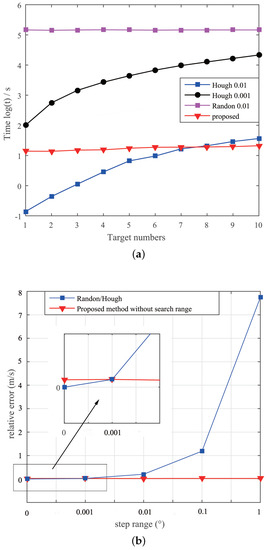 The following numerical results are obtained by simulation with the parameters presented in Table 2. It is well-known that HT has a better performance than RT in term of computation complexity. From this point of view, the following performance comparison focuses on the HT and the proposed algorithm. Figure 7a shows the computing time versus the number of moving targets for HT and the proposed algorithm, since the computing time is directly related to the complexity of algorithm. It can be seen that the proposed algorithm has almost a constant computing time irrespective of the number of moving target increasing. In contrast, the computing time for the HT algorithm is exponentially increasing as the number of the moving targets increases, especially for a high accuracy of 0.001, which gives to a reasonable good image focusing. The reason for the proposed algorithm to have significant performance in terms of computing time is that the proposed algorithm is able to provide a slope close to its theoretical value. Furthermore, when the number of moving targets is more than 7, the proposed algorithm shows superiority to HT at an accuracy of 0.01. Figure 7b shows the relative error of radial velocity for RT/HT and the proposed algorithm. It can be seen that the proposed algorithm has excellent precise result regardless the search range changes. This means that the proposed algorithm does not need to prior set up the search range. In contrast, both RT and HT need to set up the search range in order to achieve a good estimation on target moving velocity. From Figure 7a, it can be seen that the computing time is presented in scale, so that when RT or HT changes its search range from 0.01 to 0.001, the required computing time increases exponentially.