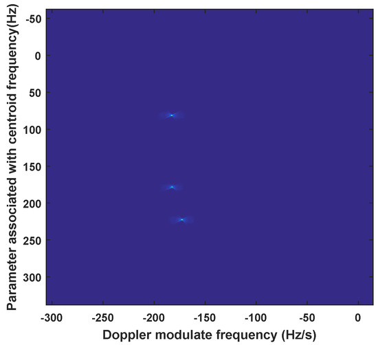 where denotes the Dirac delta function. is the estimated parameter associated with Doppler centroid frequency, is the estimated Doppler modulated rate. Then the along track velocity can be calculated by the Doppler modulate rate of the moving target as