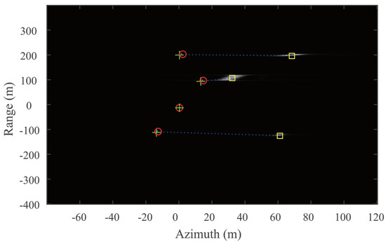 SAR moving target imaging result. The initial position of the moving target is presented by cross symbol. The displaced and defocused target is presented by square symbol. The relocated and refocused moving target using the proposed algorithm is presented by circle symbol.