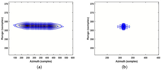 M2 contour image: (a) Range focused image after range walk correction, Doppler centroid shift compensation and the cubic term compensation; (b) Final focused image.