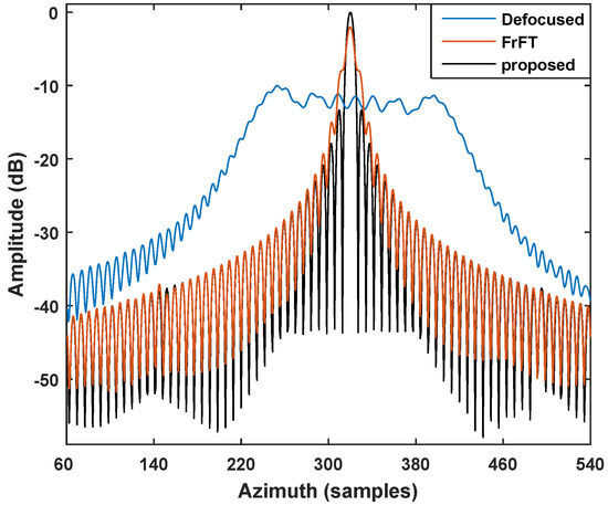 After the aforementioned operations, the radial velocity can be obtained and the response of the moving target is concentrated into a onefold range cell. Therefore, to obtain an ideal azimuth compression, the Doppler modulate rate is mainly considered in the following analysis. When RCMC and IFT are conducted, the echo signal in Equation (6) can be simplified expressed with the single variable as