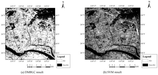 - DMBLC achieved high performance of ISA extraction, with OA equaling 94.45% and KC equaling 0.8885, respectively. The OA and KC of DMBLC were 8% and 0.12 more than those for the SVM method, respectively, revealing the higher accuracy of indirect ISA extraction (DMBLC) than direct extraction (SVM).