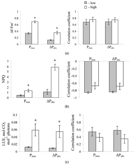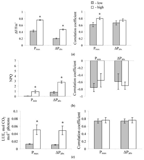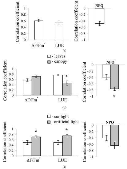 - We analyzed correlations of PRI with the quantum yield of photosystem II (ΔF/Fm’), the nonphotochemical quenching of chlorophyll (NPQ), and the light use efficiency (LUE). ΔF/Fm’ and NPQ were used because these parameters show the efficiency of photosynthetic light reactions and the response of photosynthetic machinery to stressors. LUE was used for the estimation of efficiency of photosynthetic assimilation;
