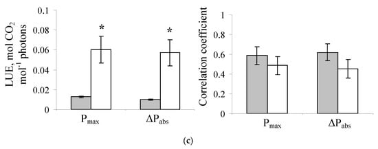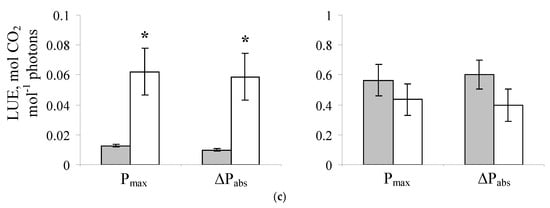 | Conditions of Measurement | Analyzed Parameter or Effect | ΔF/Fm’ | NPQ | LUE | |