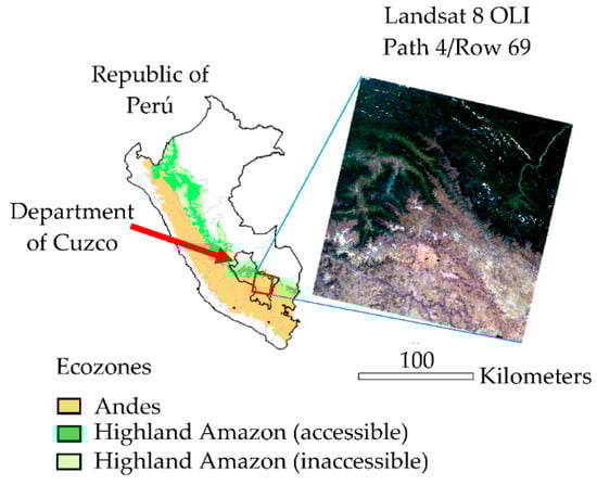 We selected a study site that showed a typical land cover mosaic using a Landsat 8 image. The scene (path 4, row 69) is located in Cuzco, Peru, with an area of 170 km × 185 km (Figure 1).
