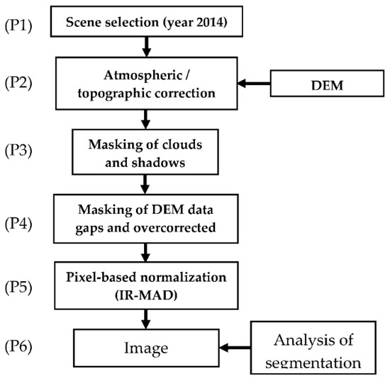 After conducting atmospheric and topographic correction for the scenes (P2) and masking of clouds, cloud shadows, and pixels with overcorrected reflectance (P3 and P4), we normalized the satellite data. We conducted this process on pairs of overlapping scenes using the Iteratively Reweighted Multivariate Alteration Detection (IR-MAD) algorithm (P5) [21,22] to find pseudo-invariant features that can compute a modified model [23]. The size of sample areas was 10 km × 10 km, and the sample areas included deep water bodies, concrete, and/or bare soil, aside from forest areas. This method is based on canonical correlation analysis (CCA) and is an unsupervised change detection algorithm that is invariant to linear transformations of the original data. In this method, CCA creates linear combinations of the pixel values for each of the spectral bands of the two scenes. Each pair of linear combinations are called canonical variates (CVs), and the number of CVs is equal to the number of bands. The first pair of CVs has maximal correlation, the second pair of CVs has the second highest correlation and is orthogonal to the first pair of CVs, and so on. Then, the process to determine the difference between the CVs is carried out to produce a sequence of transformed difference images called MAD variates that records the maximum spread (or maximum change) of the pixel values. The sequence generates the same number of MAD variates as the number of bands used. From these different images, we select all pixels with minimum or no change (called Pseudo-Invariant Features, PIFs) that satisfy Formula (1):