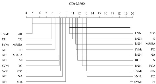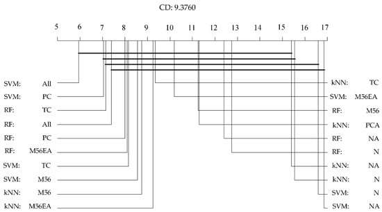 We ranked the performances of all of the models obtained with each fold and calculated the mean value of the ranks obtained per model [47]; a higher rank (1 being the highest rank) would indicate a higher performance indicator value. The mean ranks of the performance indicators were compared as well as the corresponding mean and standard deviation. Also, Friedman tests were carried out to determine if the various models yielded statistically different AUC and Cohen’s kappa values [48]. The test was conducted using the mean rank of the performances of all of the models. If the p-value of the test was significant (p < 0.05), we could reject the null hypothesis that the difference in classification performances between the models is zero. Then, using the Nemenyi post-hoc test, we carried out a pairwise multiple comparison of ranks and determined which models show a significant performance difference compared to the others by using the critical distance (CD) [49]. This test is conservative and robust when analyzing a small amount of unbalanced data. The CD value was calculated as follows: