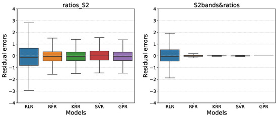 The distribution of residuals for S2 two ratios and S2 all bands + ratios are shown in Figure 2. The box-plots of the errors show the clear improvement of the non-linear ML models in comparison with the linear one (RLR) for all cases (residuals closer to zero). The use of all bands and band ratios available leads to an amelioration in the errors.