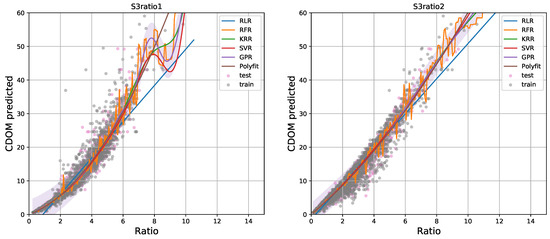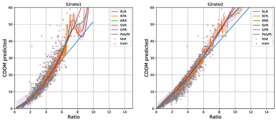 The regression plots in Figure 3 compare the performance of the models as the expression of the value of the ratio against the values of the test dataset. Data plotted are the training (gray dots) and test (pink dots) points. The Polyfit line is the polynomial regression performance of the single ratios, in dark red, an it will be taken as reference (see also Figure 1). The plot on the left shows the results for S-2 Ratio 1. Data behaves quite regularly until the absorption values are higher than 10 m, where they start to show more dispersion. At this point, it is useful to see how the RFR model behaves (orange line), because the relative over-fitting of this model is indicating areas with outliers in the training data. The RLR is following a straight line (in blue), not fitting much the data at the beginning in the lower values and at the end of the relationship, although it has the same trend than the other models. The KRR (green line) and SVR (red line) reveal a better fit with the data and between them. The GPR (purple line) model seems similar to the KRR with the final portion closer to the SVR model, taking into account the higher (400) values. The area in light gray is the 95% confidence interval of the GPR prediction (see Section 2.3). The plot on the right shows the same regression fitting for the models compared with the polynomial fitting of the S-2 Ratio 2. In this case many of the models approach the Polyfit regression closer than the the S-2 Ratio 1. The regression line of the RFR seems to be smoother than the previous one and the uncertainty of the GPR tighter. This would probably mean that the S-2 Ratio 2 is a better method to derive calibration coefficients for CDOM algorithm development with the SYKE dataset.
