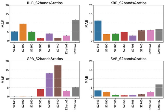An interesting tool for the analysis of the models is the permutation plots shown in Figure 4. These plots are the result of the permutation test, which calculates the probability of getting a value equal to or more extreme than an observed value of a test statistic under a specified null hypothesis by recalculating the test statistic after random re-orderings (shuffling) of the data [50]. The permutation plot can be seen as a mean of feature ranking. The statistic used is the MAE, which means that Figure 4 shows the MAE after shuffling each of the regressors times. According to our previous experience [51], permutation analysis results in robust estimates of variable relevance, and it is possible to achieve stable feature rankings with a moderate number of runs. More than 30 realizations does not reduce much the variance of the estimates. By using the permutation plots, we are measuring the importance of each of the bands to the proposed model. The S-2 all bands + ratios composition permutation plots of 4 models are shown as example. The higher the MAE value when a particular band is removed, the more weight it has in the model: that is, for the RLR bands in the blue part of the spectrum (443 and 490 nm) caused a higher MAE when removed compared with the other bands, followed by the 560 and the 705 nm bands. Precisely the combination of the 705 and the 490 is the S2-Ratio 2, which is crucial for the RLR method as observed in the plot. For the KRR method bands seem to have more balanced distribution, highlighting the importance of band at 443 nm. The GPR approach shows major weight of band 740 nm, followed by 665 nm, diminishing the role of the blue and ratio bands compared with other models. In the SVR approach, with lower MAE values than the rest, the two ratios play a major role. In general all methods highlight the importance of the bands used for the ratios or the ratios themselves, which agrees with the physical knowledge about the bands contributing more to CDOM determination.