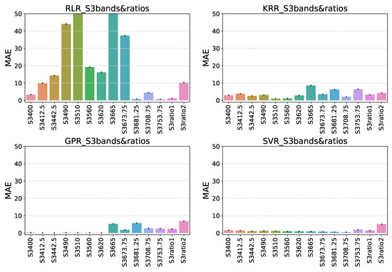 Figure 7 shows the permutation plots of the S3-OLCI bands for four models and the S3 all bands + ratios configuration. They are, in general, very similar to the ones for S2-MSI. For RLR the importance of the bands in the blue and red spectrum seems to be more relevant. The RFR model stresses the importance of the ratios when those are used as inputs (not shown), behavior also observed in S2-MSI. For the KRR model, bands at 665, 681.25 and 753.75 nm point out, but generally the weight of the bands seems too be more distributed with lower MAE than the RLR. The GPR approach shows a major weight of the red and NIR bands (673.75, 681.25 and 753.75 nm), similar to the KRR. Finally, the bands for the SVR approach behaves in a similar way in S3-OLCI and S2-MSI, with the S3-Ratio 2 pointing out. The higher weight of the blue bands in some of the approaches is expected, because the absorption maximum of CDOM takes place in these spectral ranges (400–490 nm), as it happens when the S3 all bands configuration is used (plots nor shown). The contrast of these blue bands with the spectrum in the red and NIR (620–709 nm) are the inputs used in CDOM band-ratio algorithms in many studies. When the ratios are used as inputs as well, they gain relevance, as shown for S2-MSI.