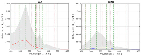Ranges and mean of reflectance spectra at S3-OLCI wavebands from the C2X dataset for C2A and C2AX subsets. The utilized S2-MSI and S3-OLCI bands are highlighted for convenience.