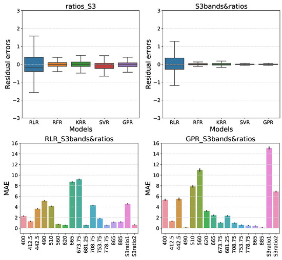 Figure 5 shows the residuals values in box plots for S3 two ratios and S3 all bands + ratios. Again the errors are reduced, in this case quite spectacularly, when using more sophisticated kernel-based methods (KRR, GPR and SVR) and they are especially low when using all inputs S3 all bands + ratios.