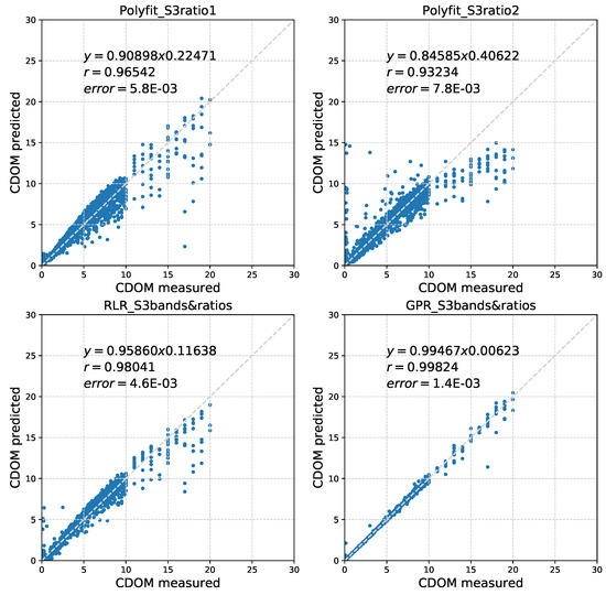As an example, plots and statistics comparing CDOM predicted (or retrieved) and CDOM measured (or simulated) for the six models and all possible band combinations have been generated. Figure 10 summarizes the main statistics using a linear regression of the two variables for some of models and band combinations. In general we obtain coefficients of correlation for all cases, except for the RLR method in S3 all bands with 0.782, and the RLR for the S3-Ratio 2. These two correlations also have the biggest standard error and deviate from the 1:1 line in the regression plots showing a negative bias. The best correlation results uses the S3 all bands + ratios combination, as pointed out before, with r values in all cases. The GPR and the SVR methods have similar results, with a slight lower error of the GPR.